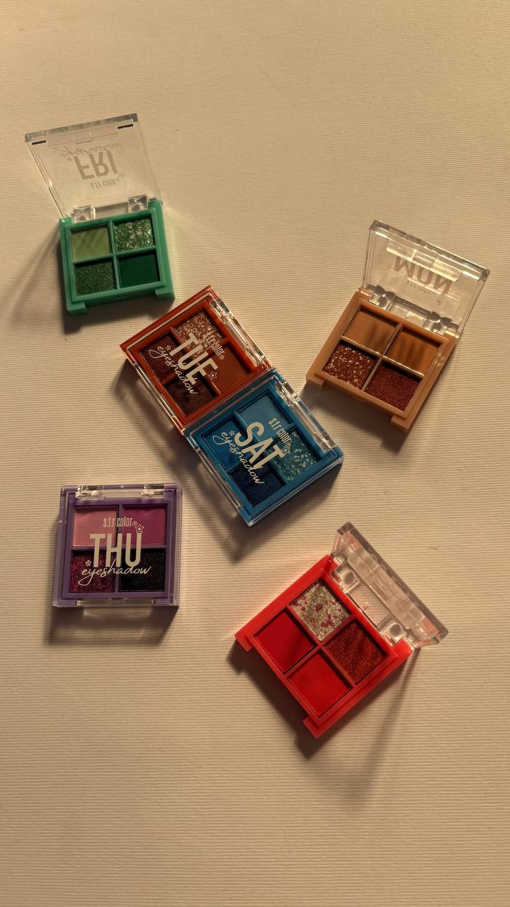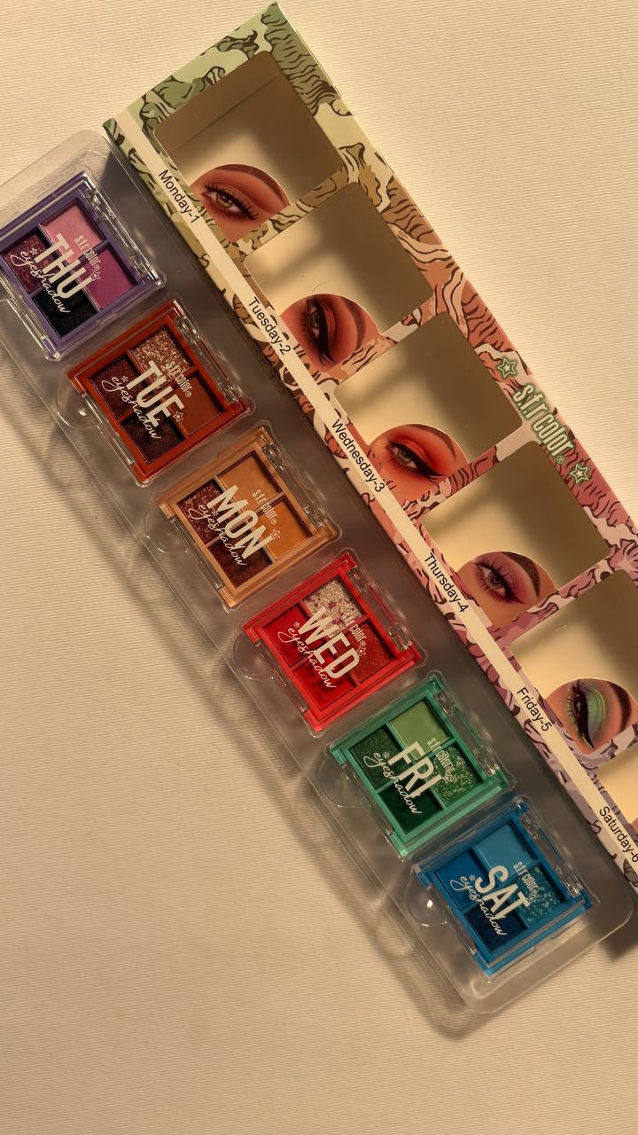 سایه ایام هفته ⚪️پیگمنت بالا ⚪️کوچک و مناسب داخل کیف ⚪️بدون ریزش ⚪️بدون ایجاد حساسیت ⚪️دارای ۶ پلت متفاوت و زیبا